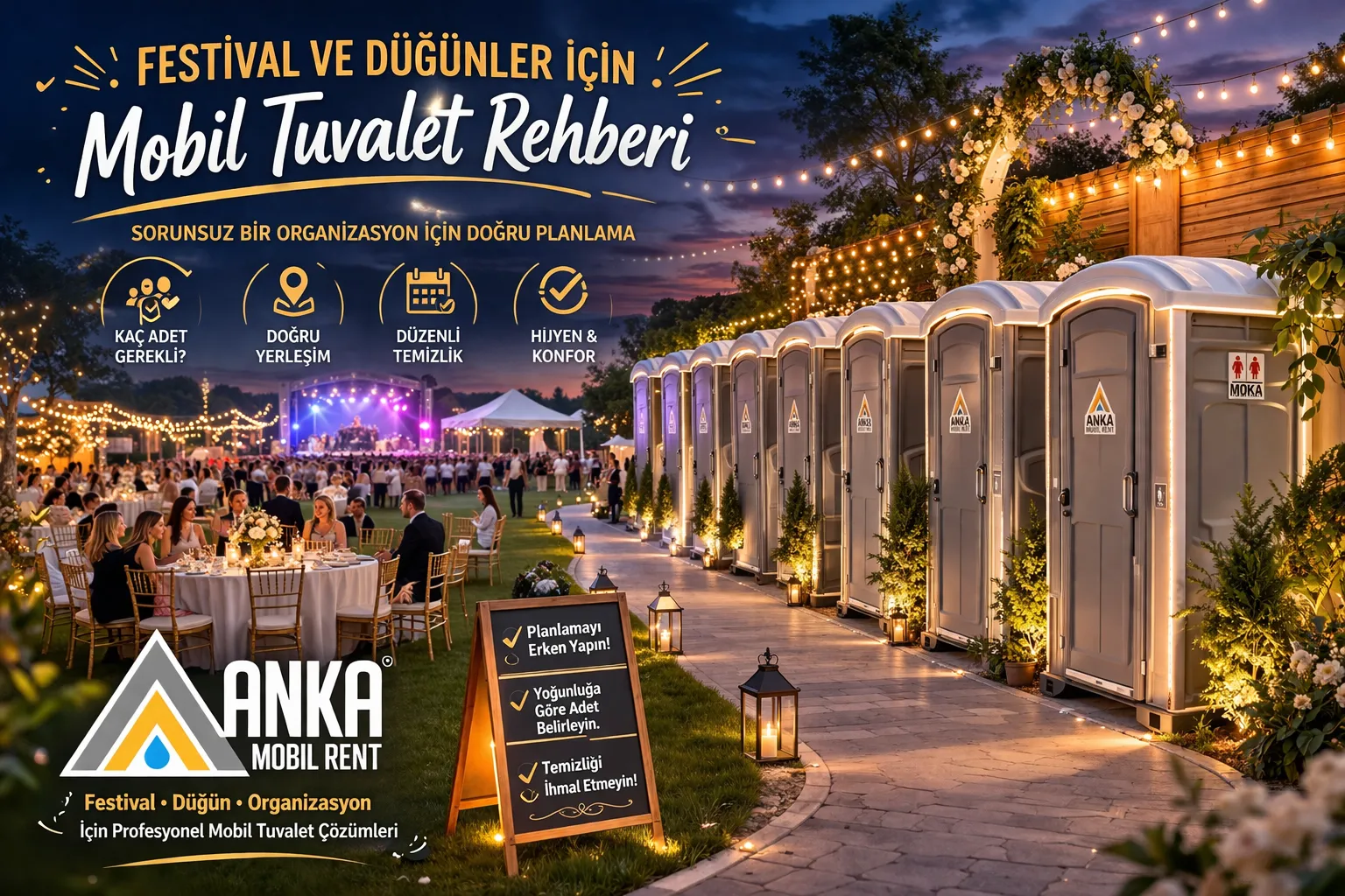 Bu yüzden mobil tuvalet, sadece bir detay değil, organizasyonun kalitesini belirleyen en önemli unsurlardan biridir. Anka Mobil Rent, festival ve düğün organizasyonlarında mobil tuvalet planlamasını profesyonel şekilde yaparak bu riskleri ortadan kaldırır.